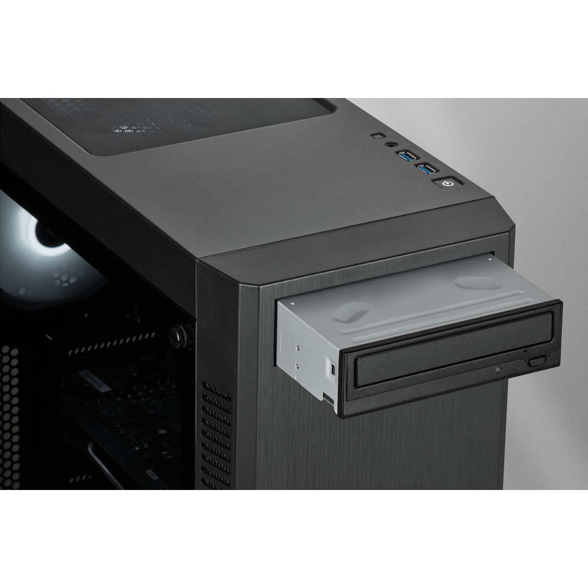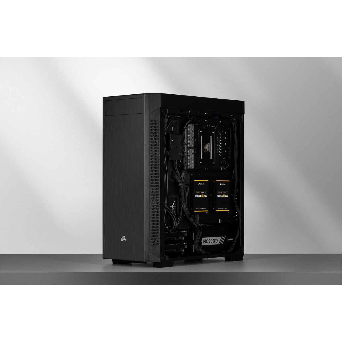 The CORSAIR 110R is a minimalist mid-tower ATX case with a 4mm-thick tempered glass side panel and storage support for up to four drives, plus a 5.25in ODD drive bay.