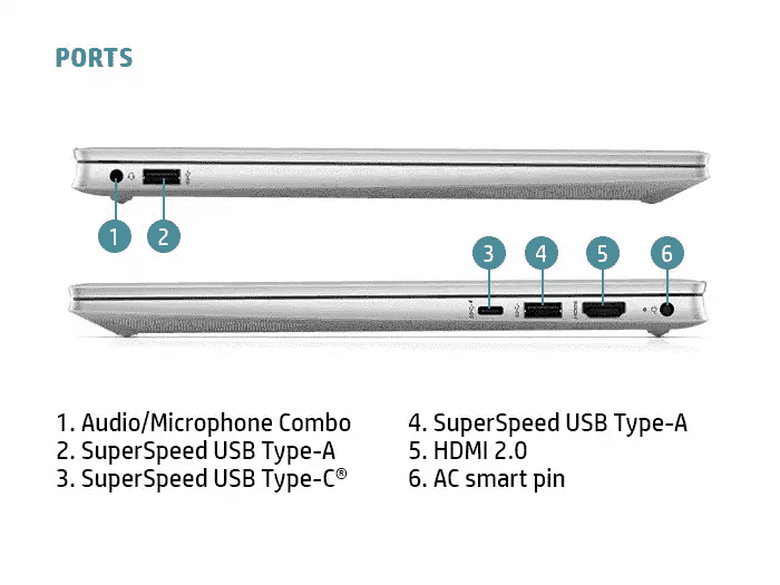 1 SuperSpeed USB Type-C 10Gbps signaling rate (USB Power Delivery, DisplayPort 1.4, HP Sleep and Charge); 2 SuperSpeed USB Type-A 5Gbps signaling rate; 1 HDMI 2.0; 1 AC smart pin; 1 headphone/microphone combo